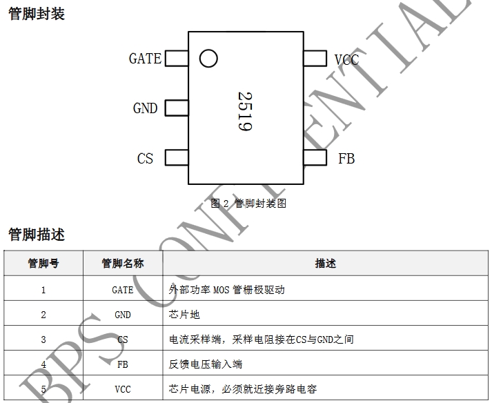 引腳排列:BP2519芯片的引腳按照功能分區(qū)排列,電源引腳通常位于芯片的一側(cè),而控制引腳和保護(hù)引腳則分布在其他區(qū)域。