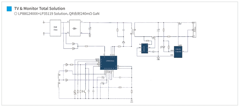 本方案旨在設(shè)計一款75W的電源,適用于需要高效率和小體積的應(yīng)用場景。方案采用高頻QR控制器LP8842xXX,以及基于GaN技術(shù)的LP88G24xxx,以實現(xiàn)高效率和高功率密度的設(shè)計目標(biāo)。
