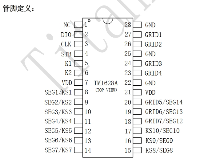 TM1628是一種帶鍵盤掃描接口的LED(發光二極管顯示器)驅動控制專用IC,內部集成有MCU 數