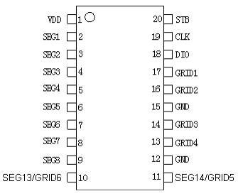 AIP1620芯片采用SOP20封裝,具有20個(gè)引腳,每個(gè)引腳都有明確的功能定義。例如,VDD引腳為邏輯電源輸入,SEG1至SEG8為段輸出引腳,GRID1至GRID6為位輸出引腳,DIO引腳用于串行數(shù)據(jù)輸入/輸出,CLK引腳為時(shí)鐘輸入,STB引腳用于片選和初始化。這些引腳的合理布局和功能設(shè)計(jì),使得AIP1620能夠與外部電路無(wú)縫連接,實(shí)現(xiàn)高效的信號(hào)傳輸和控制。