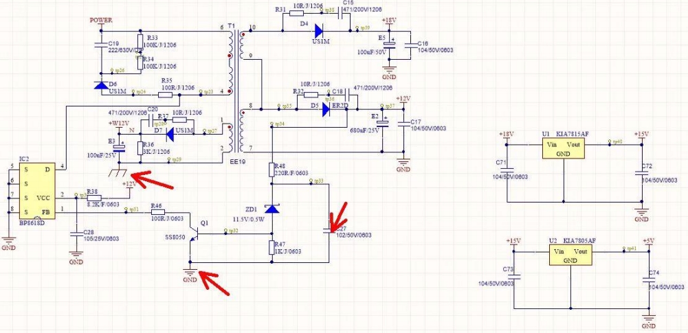 變壓器 T1:實現(xiàn)電壓轉(zhuǎn)換和電氣隔離,其多繞組結(jié)構(gòu)能夠同時提供多個獨立的輸出電壓。