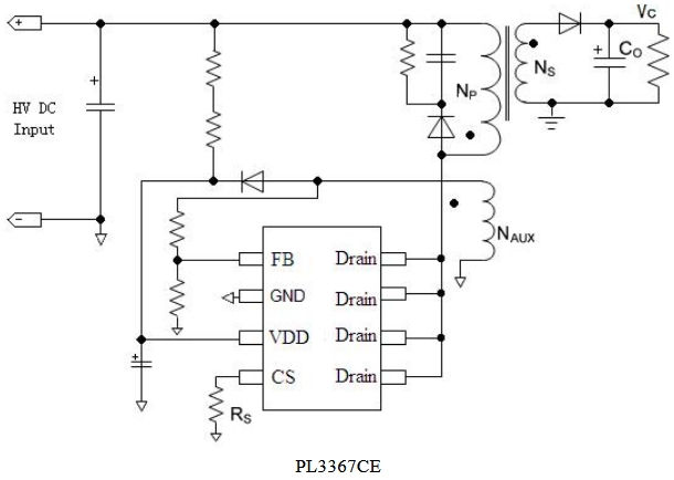 PL3367CE為小功率充電器/適配器應用提供了高效的解決方案,其新穎的恒流/恒壓控制使得系統不需要次級反饋電路,并能實現高精度的恒流/恒壓輸出,從而滿足更嚴格的能源損耗要求。