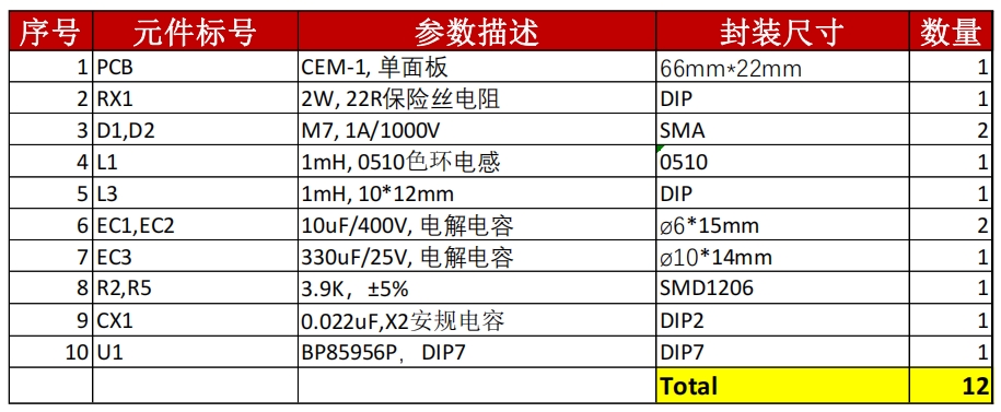 元件的選擇充分考慮了電路的穩定性和可靠性。例如,保險絲電阻 RX1 用于過流保護,確保在異常情況下保護電路不受損壞;而電解電容 EC1、EC2 和 EC3 則用于濾波,降低輸出電壓的紋波。此外,BP85956P 芯片作為核心控制元件,其性能直接影響整個電源的效率和穩定性。