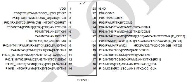 AiP8F3532 提供了多種封裝形式,包括 SOP32、SOP28、LQFP32 和 QFN32 等,以滿足不同用戶的需求。以下是其中幾種封裝形式的引腳排列圖: