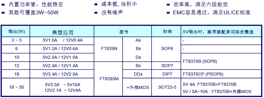 FT839xx/FT8393xx系列芯片是專為滿足DoE(美國能源部)和CoC(歐洲協調委員會)六級能效標準而設計的AC-DC恒壓恒流芯片。該系列芯片內置功率管,具備性能穩定、成本低、體積小、效率高等特點,能夠覆蓋3W~50W的瓦數范圍,廣泛適用于各種電子設備的充電器和適配器設計。