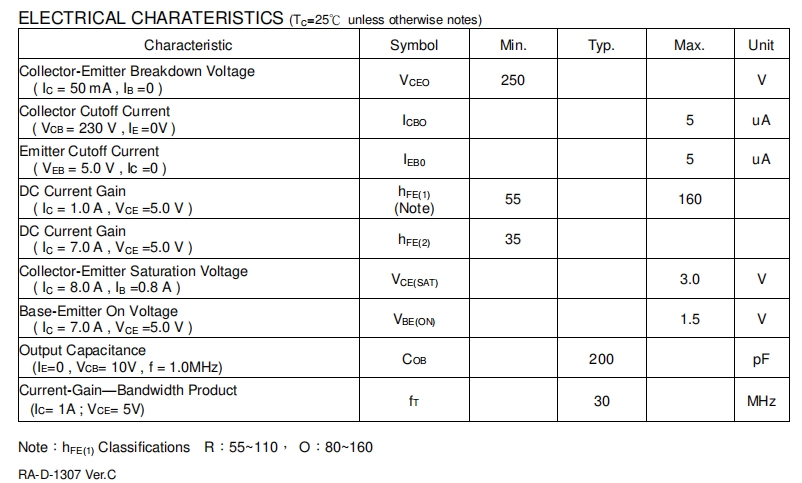 集電極 - 發射極飽和電壓(VCE(SAT)):在集電極電流為8.0A,基極電流為0.8A時,VCE(SAT)的最大值為3.0V。較低的飽和電壓意味著在晶體管導通時,能量損耗較小,從而提高了功率放大器的效率。