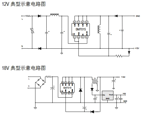 • SM7015:采用電流模式PWM控制方式,集成了高壓啟動電路和高壓功率管,適用于低成本開關電源系統,提供高性價比的解決方案。它支持12V/18V輸出電壓,應用于BUCK系統方案,具備完善的保護功能,保證系統可靠性。