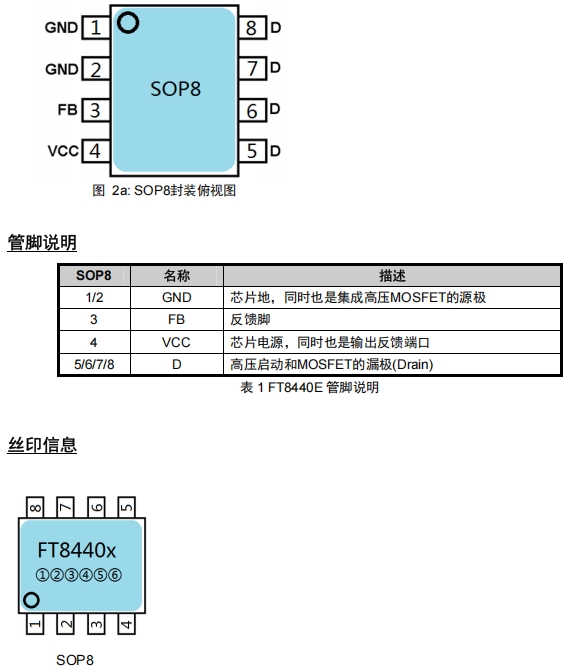 FT8440B提供SOP8封裝形式,適用于表面貼裝工藝。管腳定義如下圖所示~