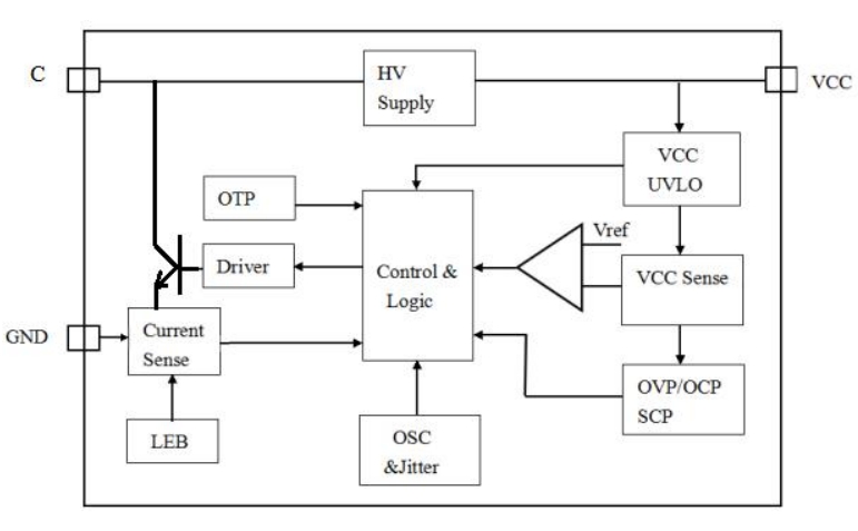 系統(tǒng)上電后,母線電壓從PL3383T的C端對(duì)VCC充電。當(dāng)VCC電壓達(dá)到開(kāi)啟閾值時(shí),芯片內(nèi)部電路開(kāi)始工作。在系統(tǒng)穩(wěn)定工作后,輸出電壓將為VCC供電。PL3383T的待機(jī)電流很低,結(jié)合其復(fù)合模式控制技術(shù),能夠顯著提高系統(tǒng)的效率,尤其是在輕載條件下。