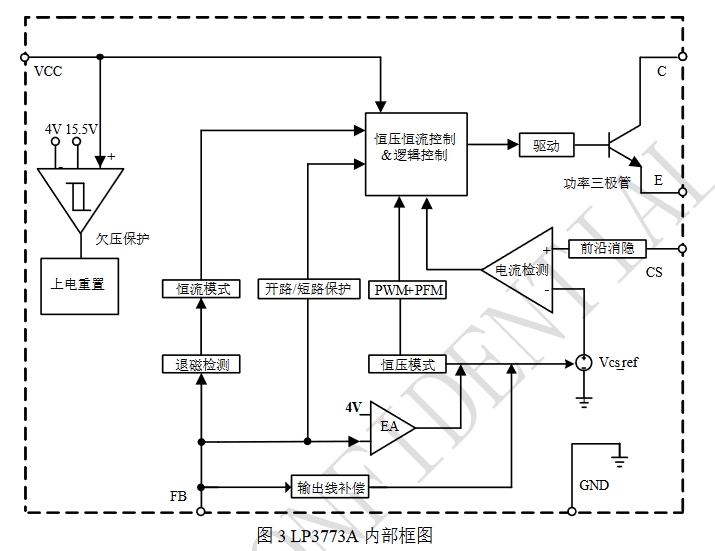 LP3773A采用SO-7封裝,集成高壓?jiǎn)?dòng)、恒壓(CV)控制及過(guò)流保護(hù)(OCP)功能,支持90-420VAC寬輸入電壓范圍。其關(guān)鍵特性包括: