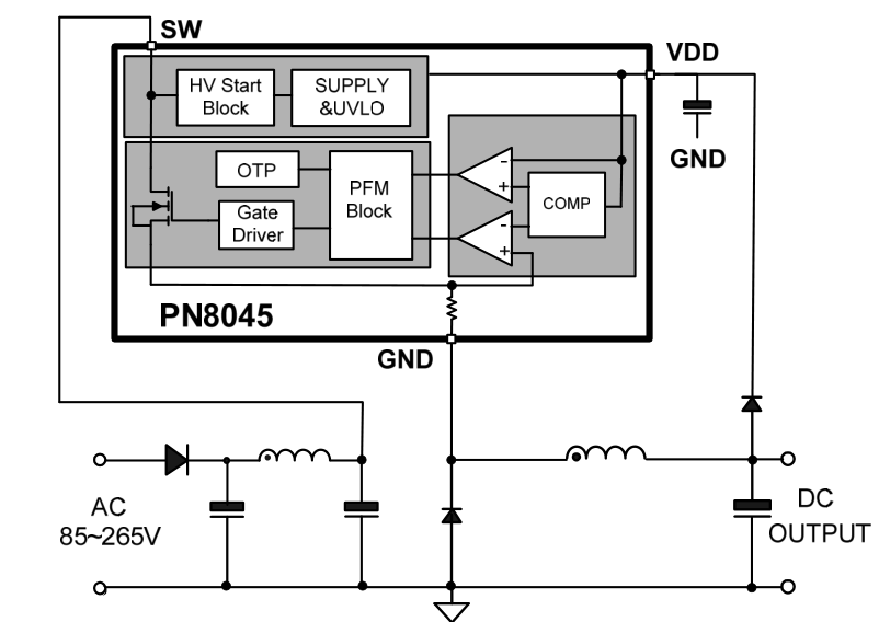 PN8045集成PFM控制器及650V高雪崩能力智能功率MOSFET,用于外圍元器件較簡(jiǎn)的小功率非隔離開關(guān)電源。PN8045內(nèi)置啟動(dòng)模塊,實(shí)現(xiàn)系統(tǒng)啟動(dòng)、待機(jī)功能。該芯片提供了智能化保護(hù)功能,包括過載保護(hù),欠壓保護(hù),過溫保護(hù)。另外PN8045的降頻調(diào)制技術(shù)有助于EMI特性。