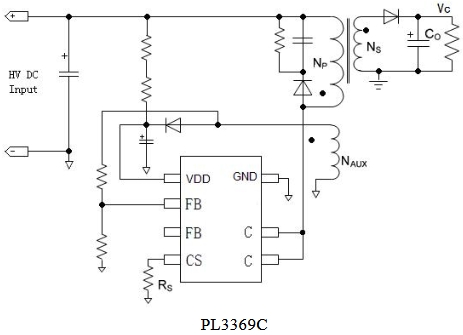 PL3369C 同時(shí)具有多種保護(hù)功能:逐周期峰值電流檢測(cè)、VDD 欠壓/過壓保護(hù)、輸出過壓保護(hù)、輸出短路保護(hù)和過溫保護(hù)等。