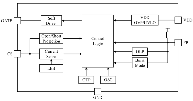 芯片通過對輸出采樣并反饋到光耦獲得高精度的恒壓輸出。內(nèi)置的斜率補償電路確保了峰值電流??刂频姆€(wěn)定性。內(nèi)部集成的頻率抖動功能可以改善EMC,降低EMI濾波成本。