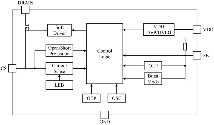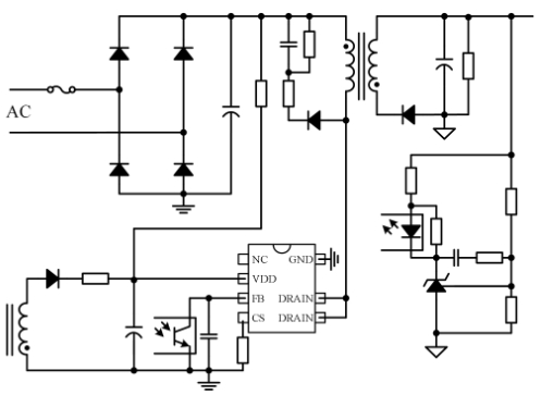 芯片通過對輸出采樣并反饋到光耦獲得高精度的恒壓輸出。內(nèi)置的斜率補償電路確保了峰值電流??刂频姆€(wěn)定性。內(nèi)部集成的頻率抖動功能可以改善EMC,降低EMI濾波成本。