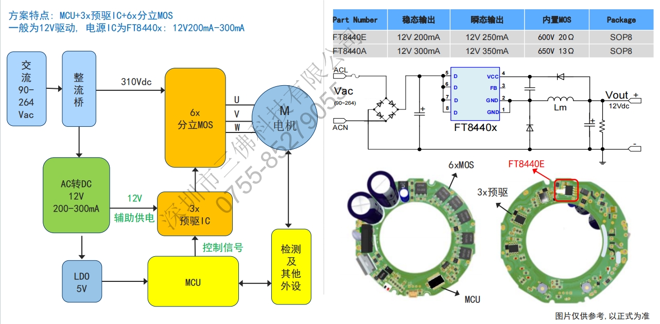 方案特點:MCU+IPM功率模塊一般為15V驅動,電源1C為FT8440x+3V穩壓管:15V200mA-300mA