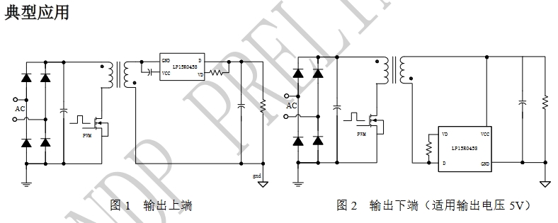 LP15R045S的典型應用電路包括輸出上端和輸出下端兩種配置,適用于不同的設計需求。在輸出上端配置中,LP15R045S通過VCC腳接收電源,D腳連接同步整流管的漏極,GND腳連接芯片地和同步整流管的源極,VD腳則用于芯片高壓供電以及信號檢測。